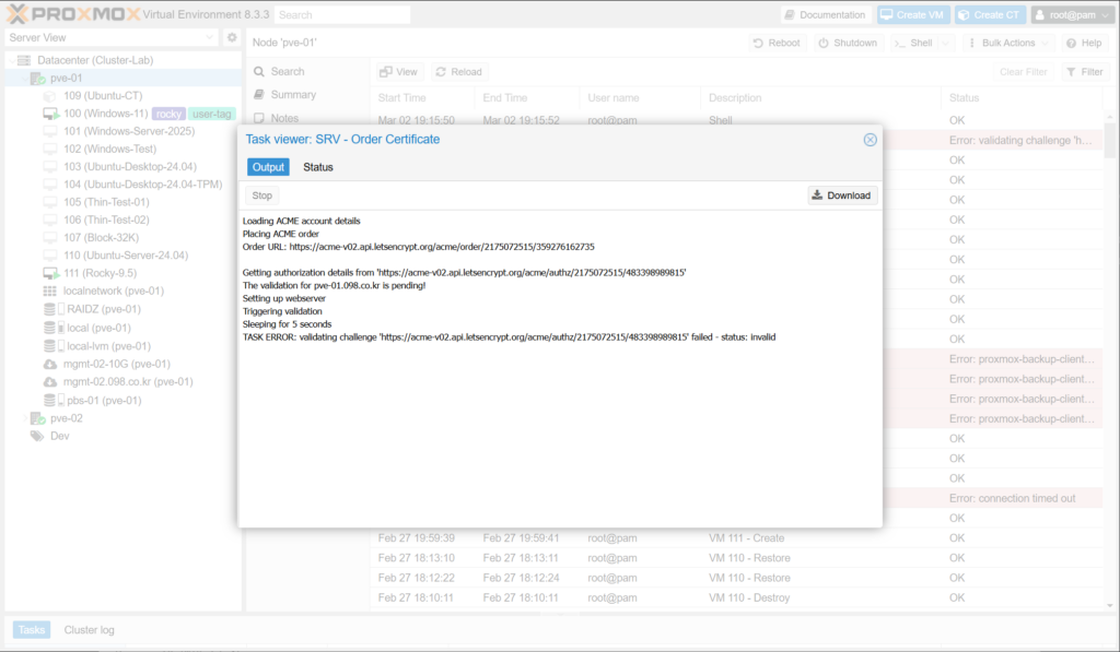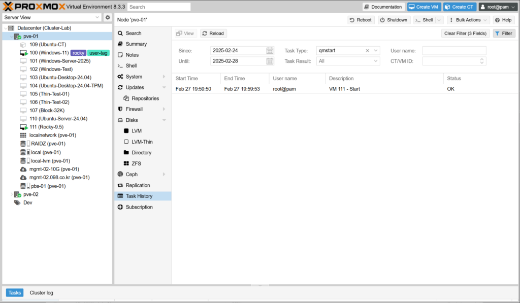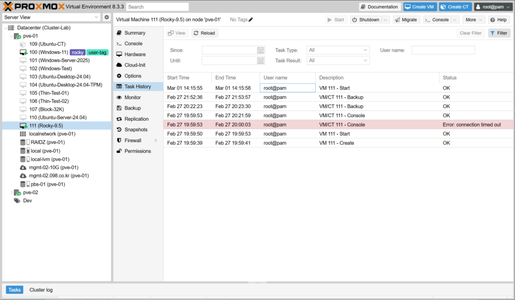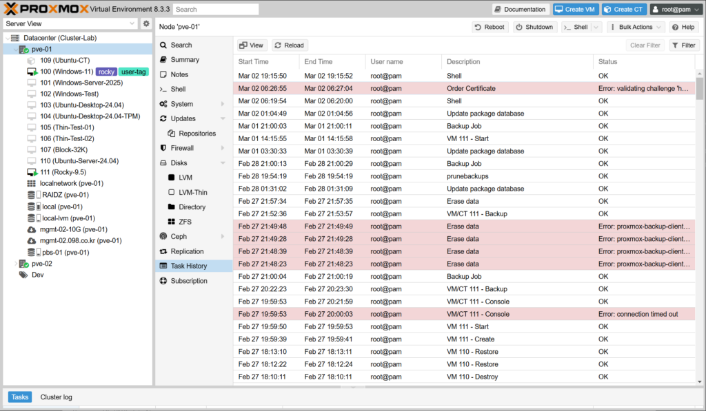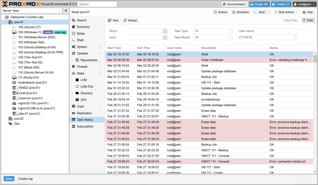 사용자의 요구에 의해서 Proxmox VE 서버에서 처리되는 작업 단위를 타스크(task)라고 합니다. 예를 들어 VM 만들기/삭제, 백업, 복제, 마이그레이션 등과 같은 작업을 타스크라고 부릅니다. 이러한 타스크는 성공하건, 실패하건 모두 기록을 남깁니다. 이 타스크의 기록 내역이 바로 Task History(작업 기록/로그) 입니다.