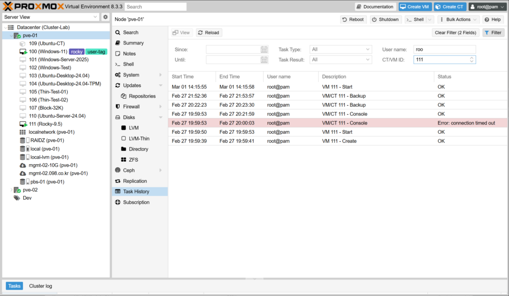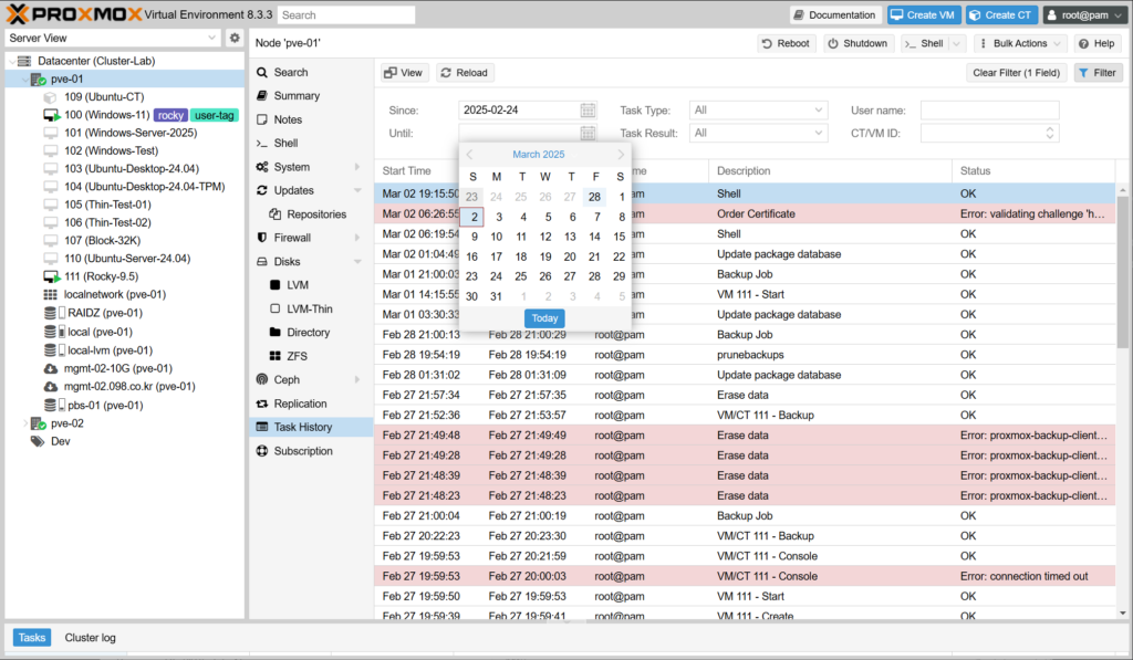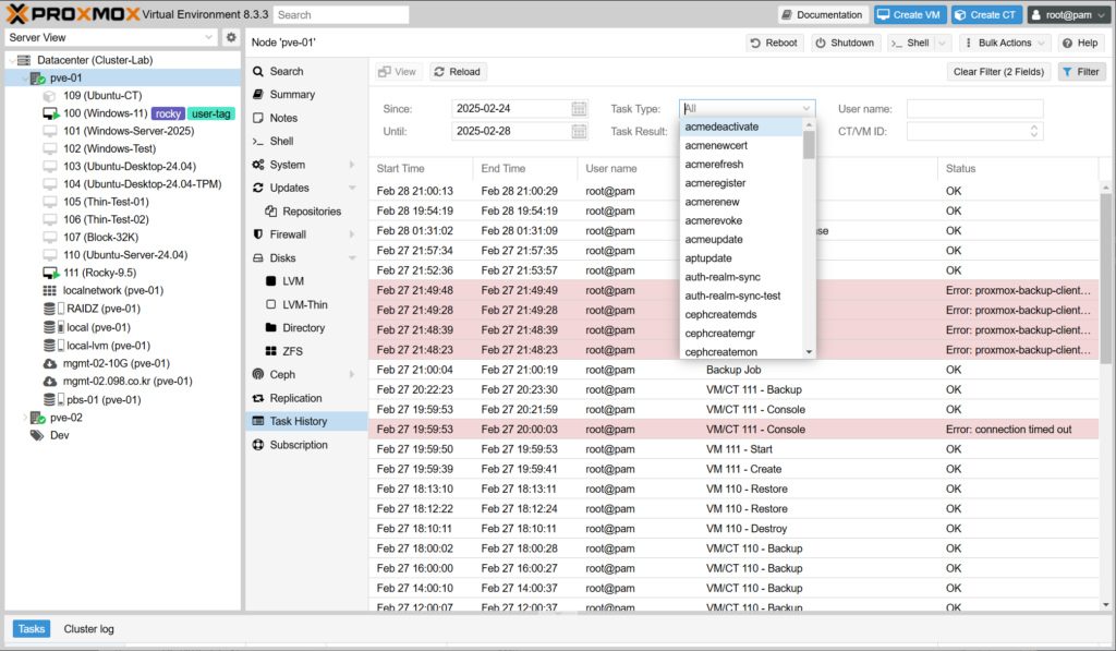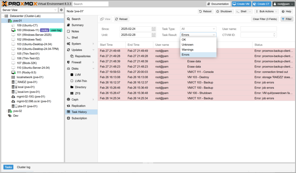 작업 내역이 많다 보면 원하는 내역이 한눈에 잘 안들어옵니다. 이런 경우에 날짜, 타스크 유형, 타스크 결과, 사용자 이름, CT/VM ID등으로 걸러주는 기능입니다.