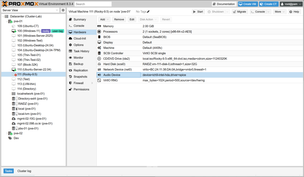 VM에 오디오 장치를 제공합니다. 원격에서 오디오를 사용하려면 드라이버 유형에서 SPICE를 선택하고, 게스트 OS에 SPICE 드라이버를 설치해 주어야 합니다.