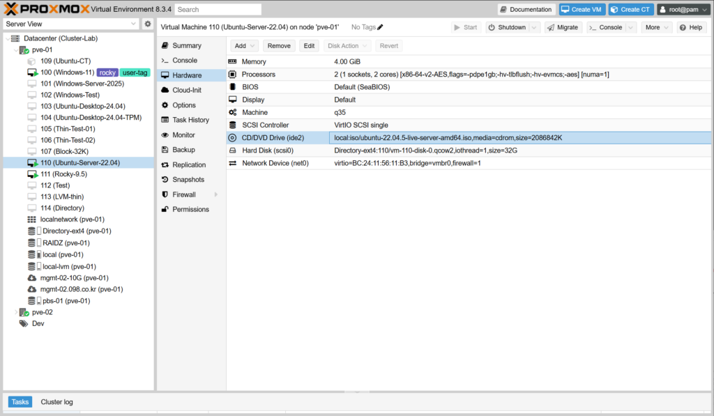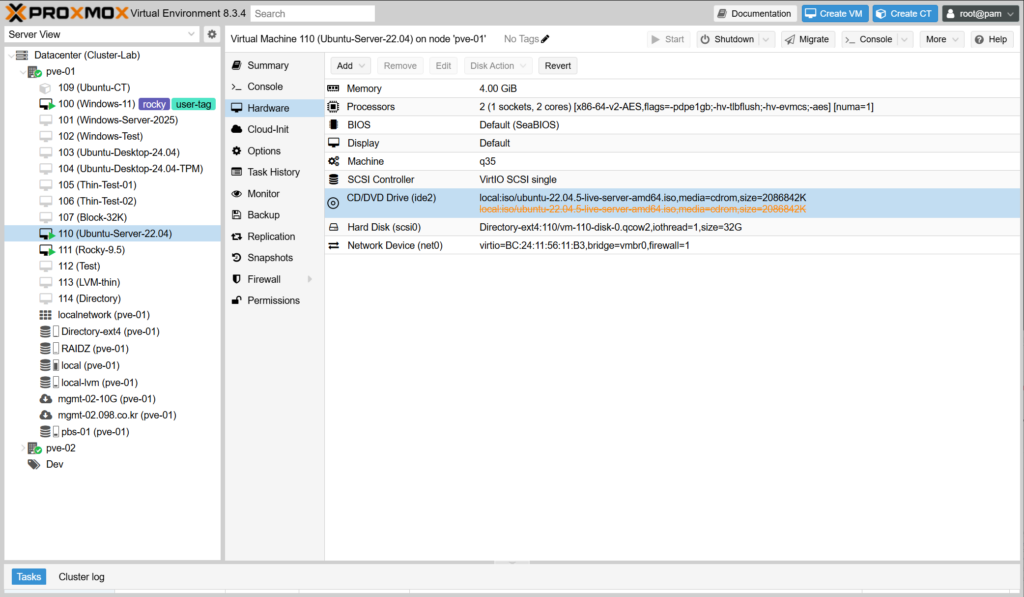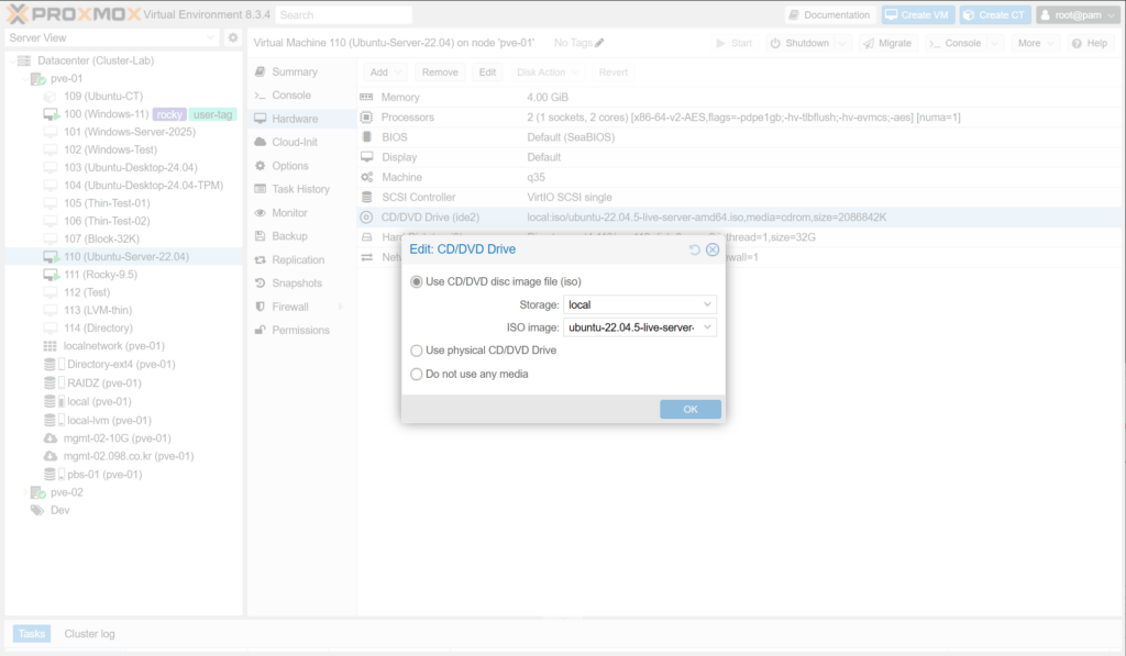 - Use CD/DVD disc image file (ISO) : 스토리지에 저장되어 있는 ISO 이미지를 가상의 CD/DVD 드라이브에 연결합니다.