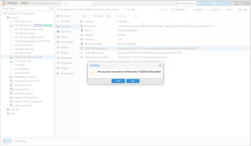 CD/DVD 드라이브는 게스트 OS 설치 또는 소프트웨어 설치용으로 많이 사용됩니다. 게스트 OS 설치 이후에 필요 없으면 제거(Remove)해도 관계 없습니다.