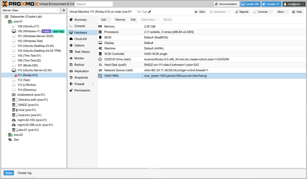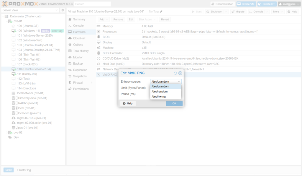 - /dev/hwrng : 하드웨어 기반 난수 발생기, Proxmox VE에서 지원하는지 확인하고 사용