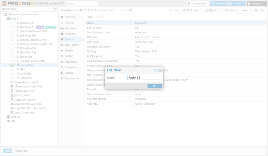 VM의 이름을 수정합니다. 이름은 VM을 구분하는 용도로 사용됩니다. 내부적으로는 VM ID가 사용되기 때문에, 이름을 변경해도 동작에 영향을 주지 않습니다.