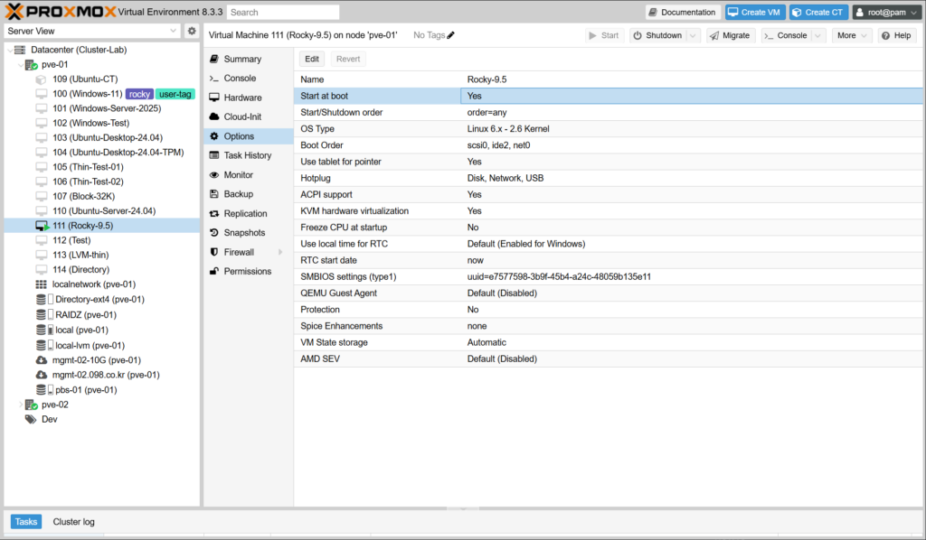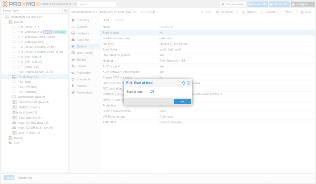 노드가 시작/재시작 할 때 해당 VM을 자동으로 시작할지 여부를 지정합니다. 체크 상자를 선택하면 자동으로 시작됩니다.