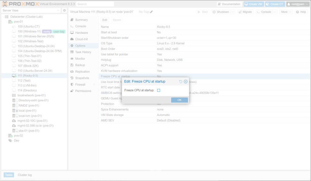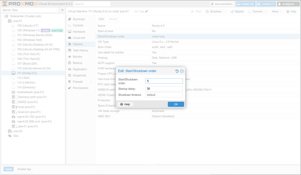 - Start/Shutdown order: 시작 순서 우선 순위를 정의합니다. 예를 들어 VM이 가장 먼저 시작되도록 하려면 1로 설정합니다. 종료 시에는 시작 순서를 반대로 사용하므로 시작 순서가 1인 머신이 가장 마지막으로 종료됩니다. 호스트에 정의된 순서가 동일한 VM이 여러 개 있는 경우 VMID에 따라 오름차순으로 추가적으로 순서가 지정됩니다.