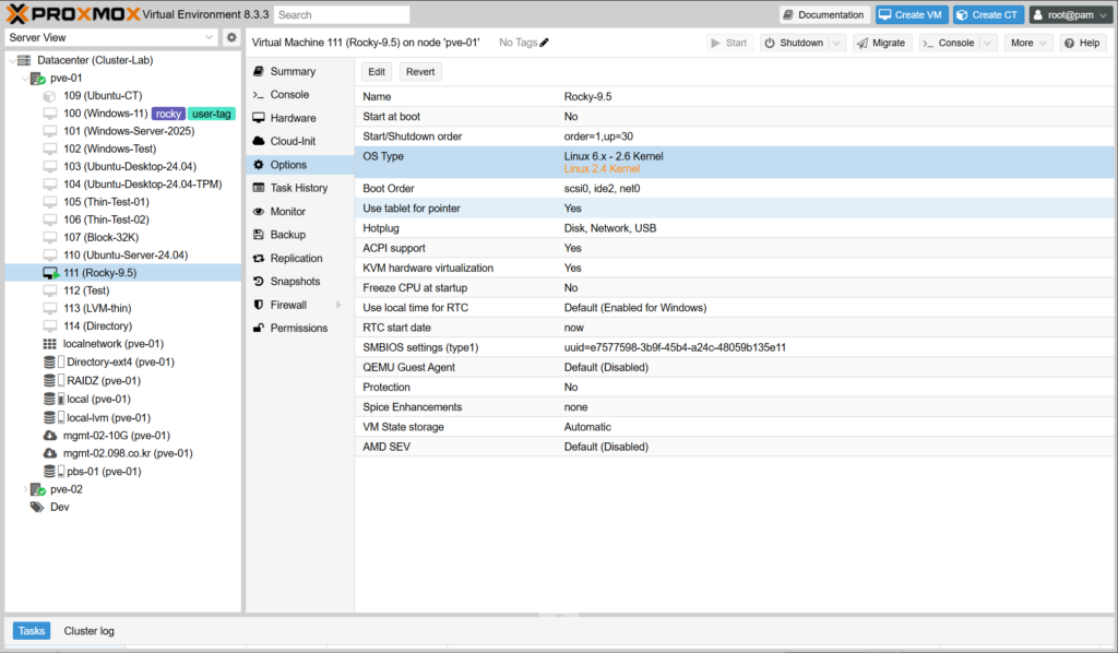 - Shutdown timeout: 종료 명령을 실행한 후 VM이 오프라인 상태가 될 때까지 Proxmox VE가 대기해야 하는 기간(초)을 정의합니다. default는 180이 적용됩니다. 이것은 Proxmox VE가 종료 요청을 실행한 후 머신이 오프라인 상태가 될 때까지 180초 동안 기다린다는 의미입니다. 시간 초과 후에도 머신이 여전히 온라인 상태이면 강제로 중지됩니다. 기본값 이외의 값을 사용할 경우에는 초 단위로 지정해 줍니다.