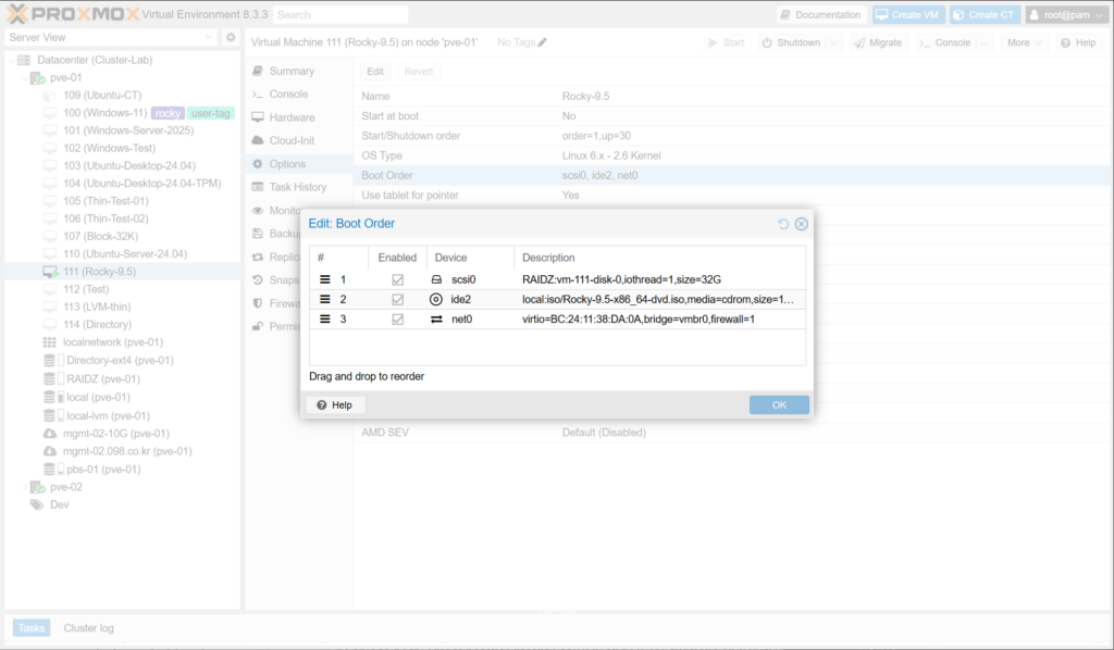 그림의 경우 VM이 제일 먼저 scsi0에서 부팅을 시도하고, 실패하면 ide2에서 CD 이미지로 부터 부팅을 시도한 다음, 이것도 실패하면 net0에서 네트워크 부팅을 시도합니다.