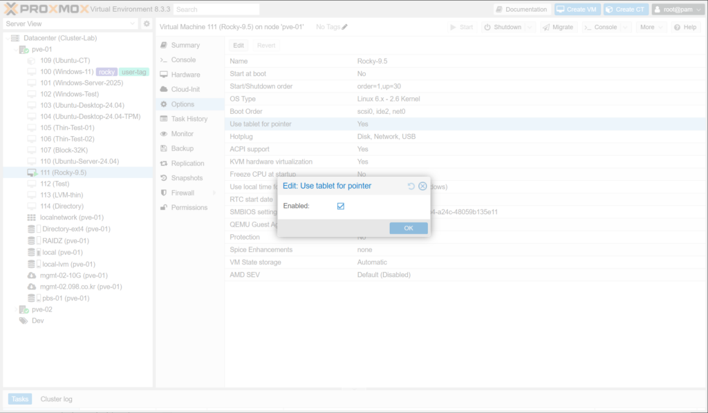 USB 태블릿 장치를 활성화/비활성화합니다. 이 장치는 일반적으로 VNC에서 마우스 위치를 절대적으로 지정하는 데 필요합니다. 그렇지 않으면 마우스가 일반 VNC 클라이언트와 동기화되지 않습니다.