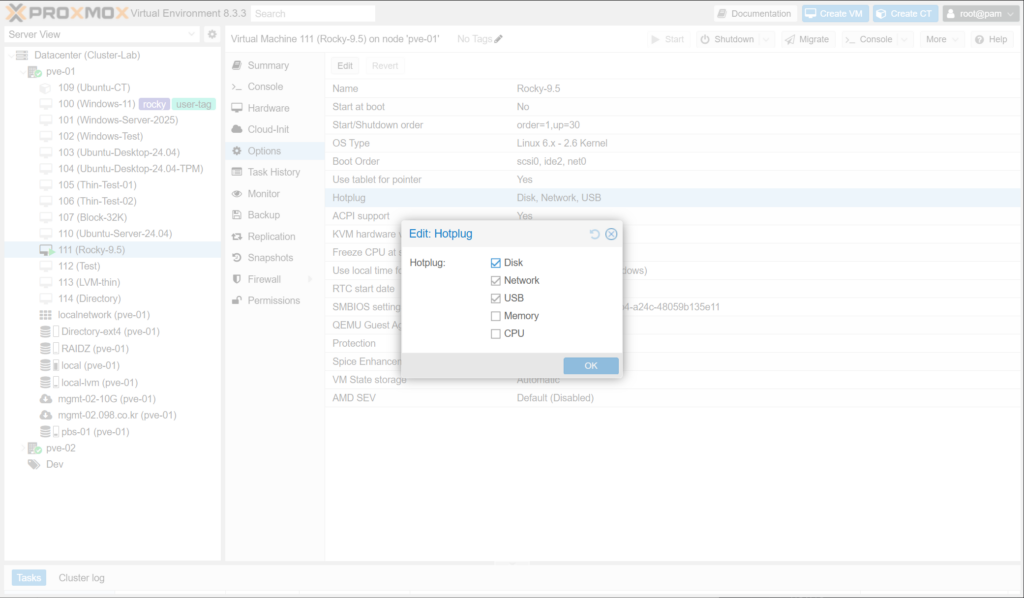 핫플러그 기능을 선택적으로 활성화합니다. 그림에서 보는 것 처럼 총 5가지 항목에 대해서 핫플러그를 활성화/비활성화할 수 있습니다.