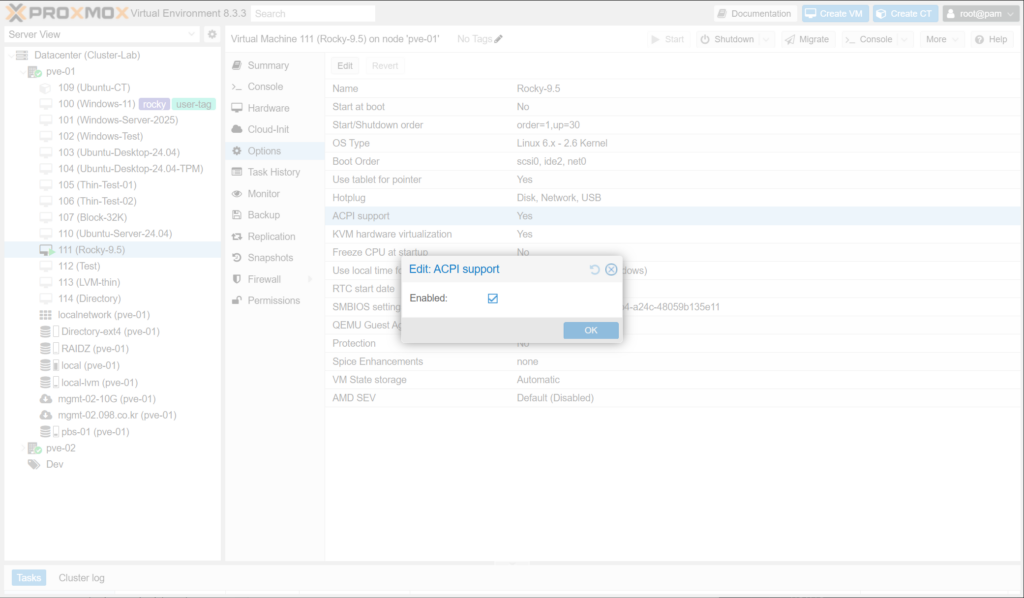 ACPI 전원 관리 기능을 활성화/비활성화합니다. 기본값으로 활성화되며, VM이 OS 종료 명령을 정상적으로 처리하는 데 필요합니다.