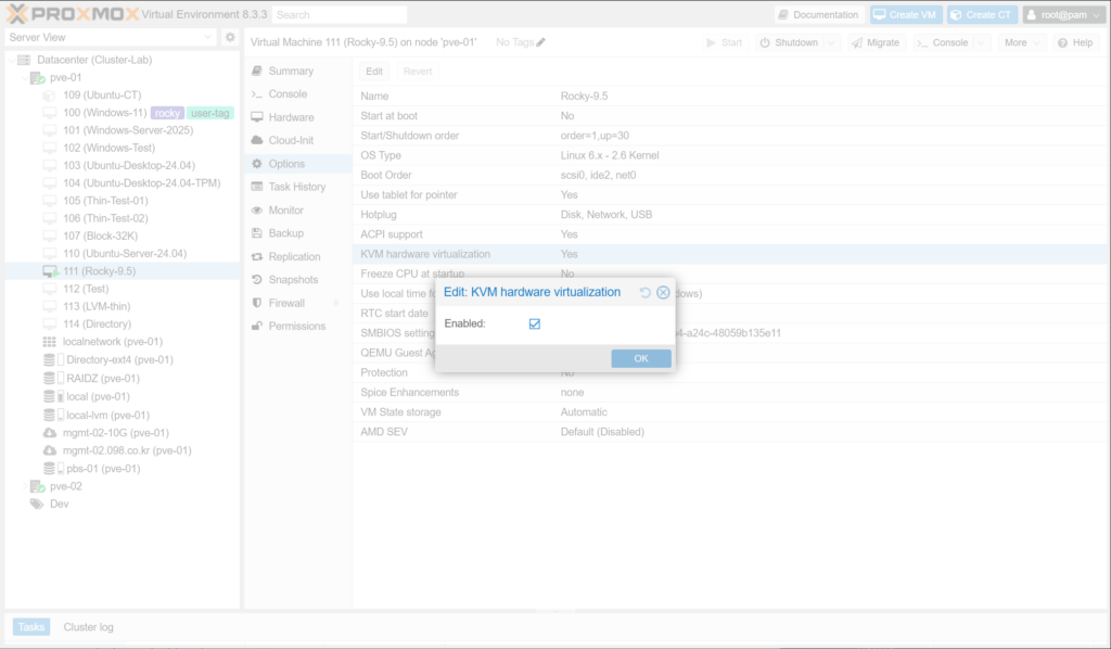 KVM 하드웨어 가상화 기능을 사용할지 여부를 설정합니다. 기본값으로 활성화되어 있고, 비활성화하면 VM 성능이 떨어집니다.