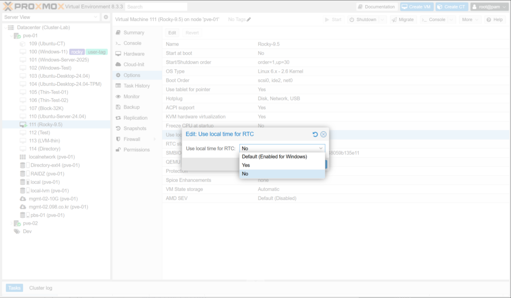 VM의 RTC(Real-Time Clock) 설정을 지정합니다. 이 옵션을 확성화하면 VM의 RTC를 노드의 로컬 시간(Local Time)과 동기화합니다.