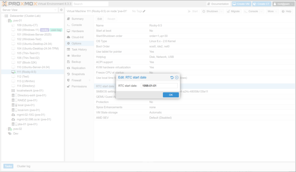 VM의 RTC(Real-Time Clock)가 처음 설정될 때 사용할 날짜를 지정하는 기능입니다. 기본적으로 Proxmox VE는 VM을 부팅할 때 호스트의 현재 시간을 RTC에 설정합니다. 그러나, 특정한 과거 또는 미래의 특정 날짜로 RTC를 초기화하고 싶다면 이 옵션을 사용할 수 있습니다.