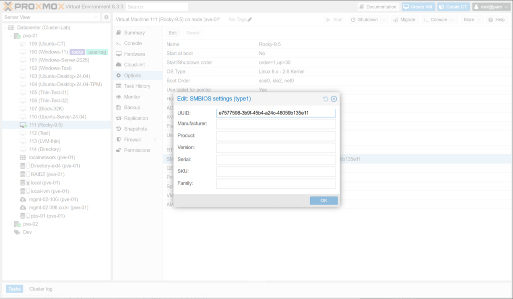 VM의 SMBIOS 기반의 라이센스 유지, 특정 제조사의 하드웨어 에뮬레이션, UUID 값 고정 등이 필요한 경우에 유용하게 사용됩니다.