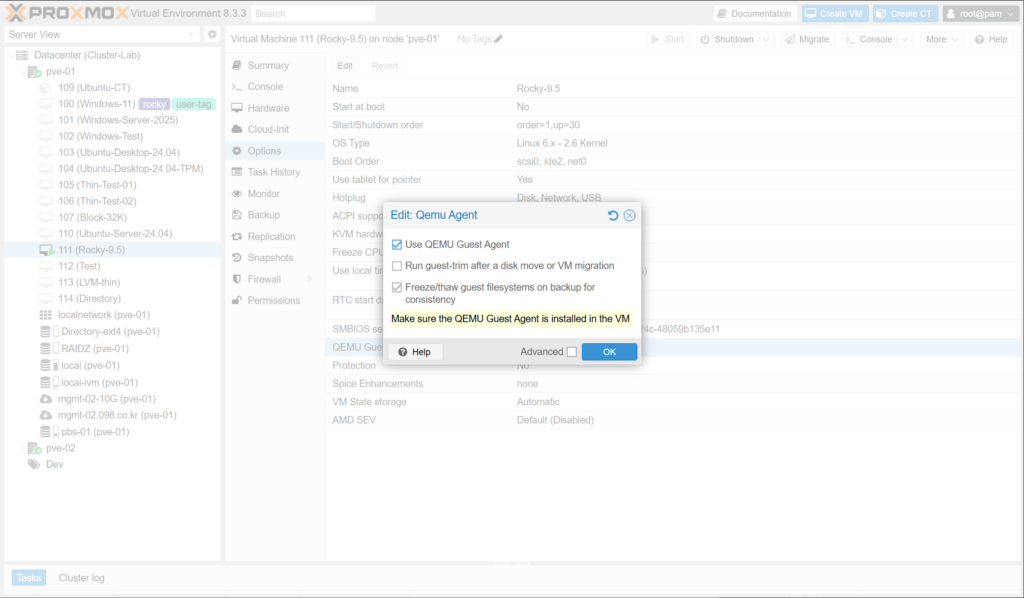 VM의 게스트 OS에 설치되는 QEMU Guest Agent와의 통신 기능의 활성화/비활성화를 지정합니다. 기본값은 비활성화로 설정되어 있습니다. 게스트 OS에 QEMU Guest Agent를 사용하는 경우에는 활성화시켜 주면 VM의 IP 주소, CPU/메모리 사용량, 디스크 상태 등을 Proxmox VE가 직접 조회할 수 있게됩니다.