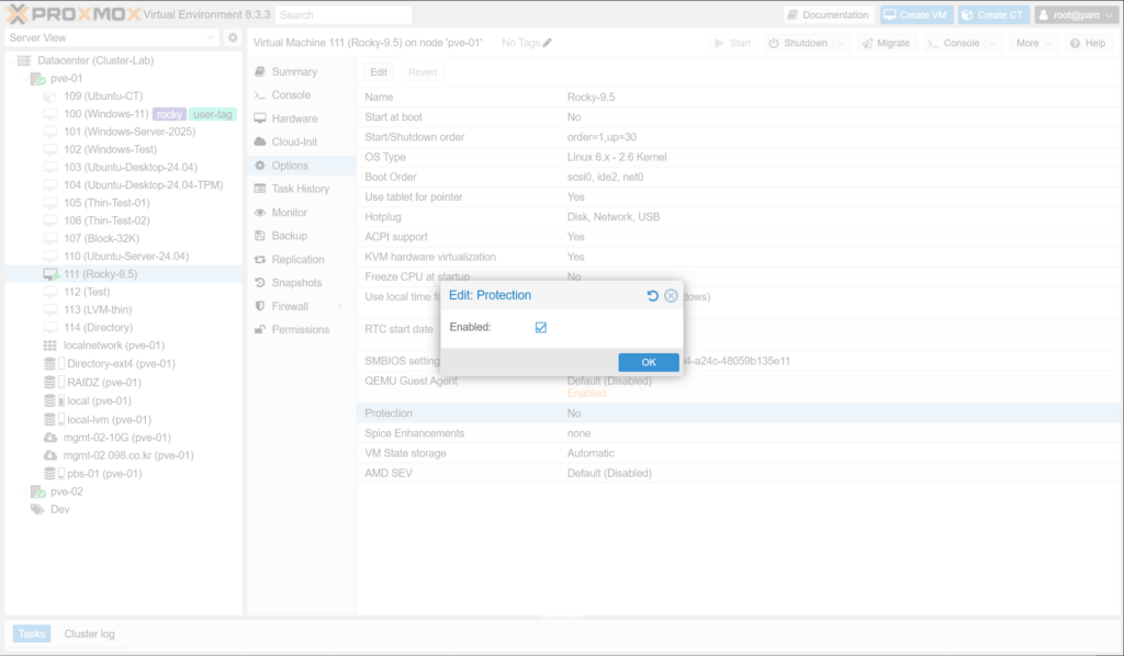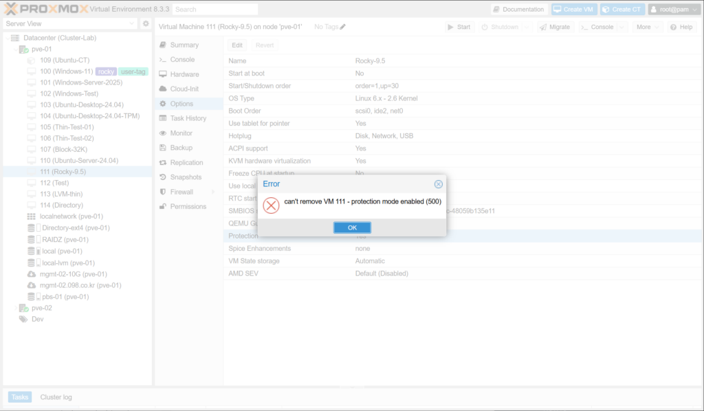 VM 또는 CT가 실수로 삭제되거나 디스크가 제거되는 것을 방지하는 기능입니다.