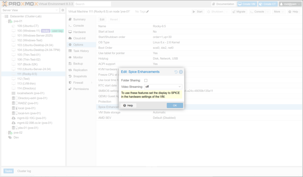 SPICE 프로토콜을 사용할 때 Folder Sharing, Video Streaming 기능의 활성화 여부를 설정합니다.
