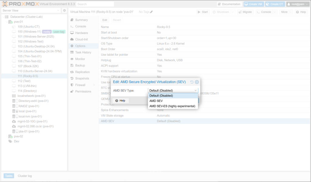 AMD EPYC 프로세서에서 지원하는 하드웨어 기반 가상화 보안 기술을 설정합니다. 기본값은 비활성화 되어 있고, 다음 두 가지 방식 중에서 선택할 수 있습니다.