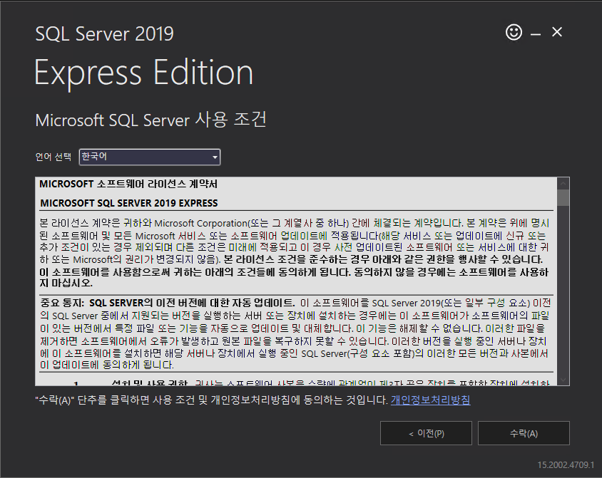 Microsoft SQL Server 사용 조건 화면이 나온다. 내용을 확인하고 “수락(A)”을 클릭한다.
