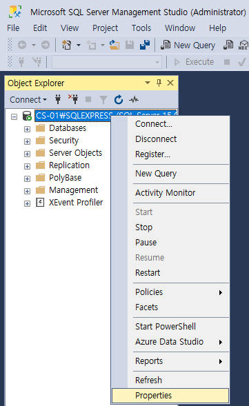 데이터베이스 서버를 선택 > 오른쪽 마우스 버튼을 클릭 > Properties 선택한다.