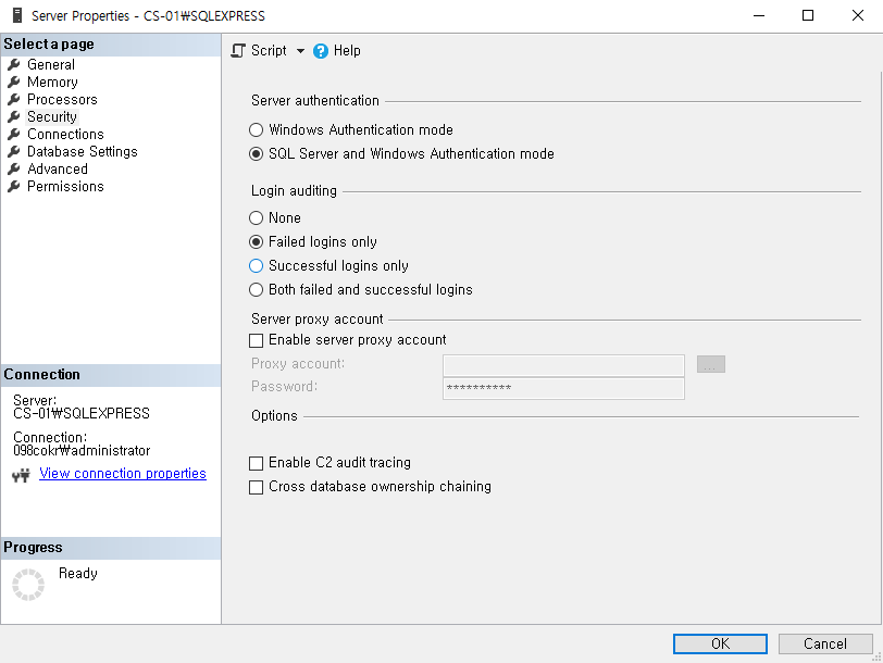 Server Properties 대화상자에서 왼쪽에서 Security를 선택한다.