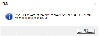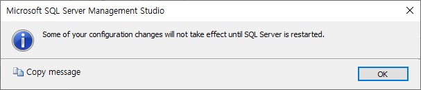 적용을 위해서 SQL Server를 재시작해야 한다는 대화상자가 표시된다. 일단 OK를 누른다.