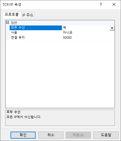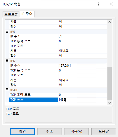 더 아래로 내려가서 IPALL 부분에서 TCP 포트를 선택하고, 1433을 입력해준다. 그 다음 “확인”을 누른다.