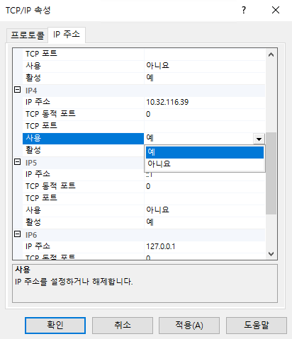 “IP 주소” 탭으로 이동한다. 아래쪽으로 내려가다보면 서버의 IP 주소가 적혀 있는 부분이 있을 것이다. 여기서 “사용”을 “예”로 변경해준다.