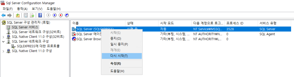 오른쪽에서 SQL Server (SQLEXPRESS)를 선택하고, 오른쪽 버튼을 클릭하고, “다시 시작(T)”을 클릭한다.