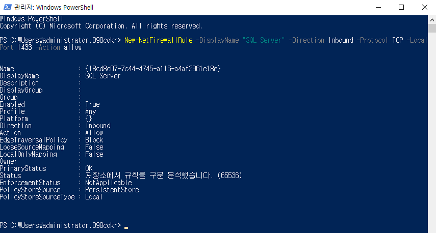 방화벽을 UI를 통해서 할 수도 있으나, 간단히 한줄로도 설정할 수 있다. 파워쉘(PowerShell) 창을 열고 다음과 같은 명령을 실행한다.