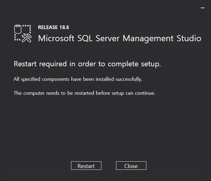 약 2분 정도 소요된 것 같다. 설치가 완료되면 “Restart”를 클릭해서 재시작한다.