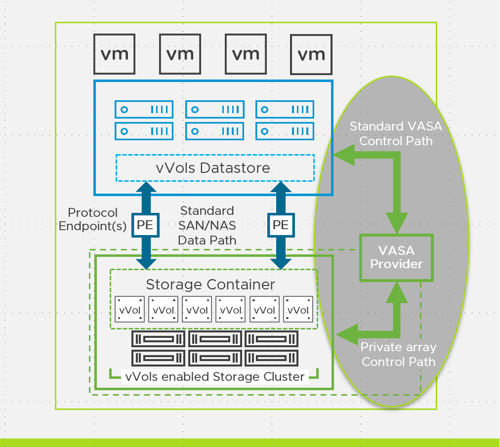 vSphere 호스트와 vCenter Server는 VASA 제공자에 연결하여 사용 가능한 스토리지 토폴로지, 기능 및 상태에 대한 정보를 얻는다.