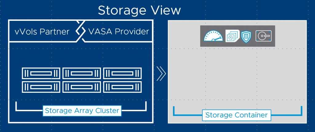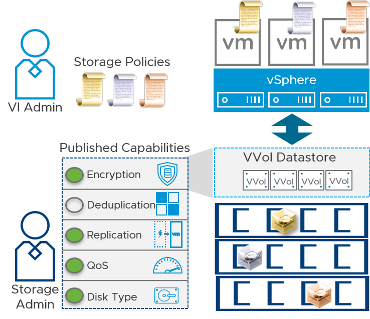 Virtual Volumes를 사용하면 이러한 접근 방식이 근본적으로 변경된다. vSphere 관리자는 정책을 사용하여 애플리케이션 요구 사항을 스토리지 어레이에 전달한다. 스토리지 어레이는 애플리케이션 요구 사항과 경계에 정확하게 매핑되는 개별 스토리지 컨테이너로 대응한다.