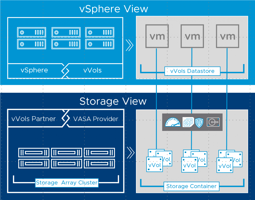 vSphere Virtual Volumes는 VMware Software-Defined Storage 비전의 핵심 테넌트를 구현하여 외부 스토리지에 대한 보다 근본적으로 효율적인 운영 모델을 지원한다.