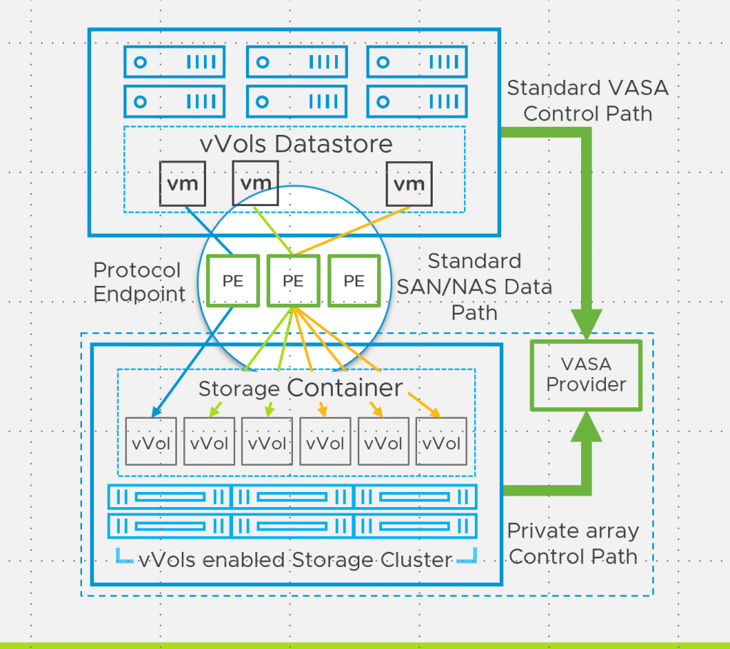 일반적으로 가상 데이터스토어는 스토리지 관점에서 데이터 관리가 수행되는 가장 낮은 세분화 레벨이다. 그러나 단일 가상 데이터스토어에는 여러 가상 시스템이 포함되어 있으며, 이러한 가상 시스템에는 서로 다른 요구 사항이 있을 수 있다. 기존의 접근 방식으로는 가상 머신 수준에서 차별화가 어렵다. Virtual Volumes 기능은 스토리지 관리에 대한 새로운 접근 방식을 제공하여 애플리케이션별 가상 시스템 서비스를 차별화할 수 있도록 한다.