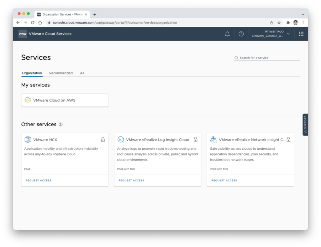 교육 신청할 때 사용한 VMware 계정을 이용해서 VMware Cloud Services에 접속해서 실습을 진행합니다. 아래 그림은 제 받은 실습 Lab에 로그인한 화면 입니다.
