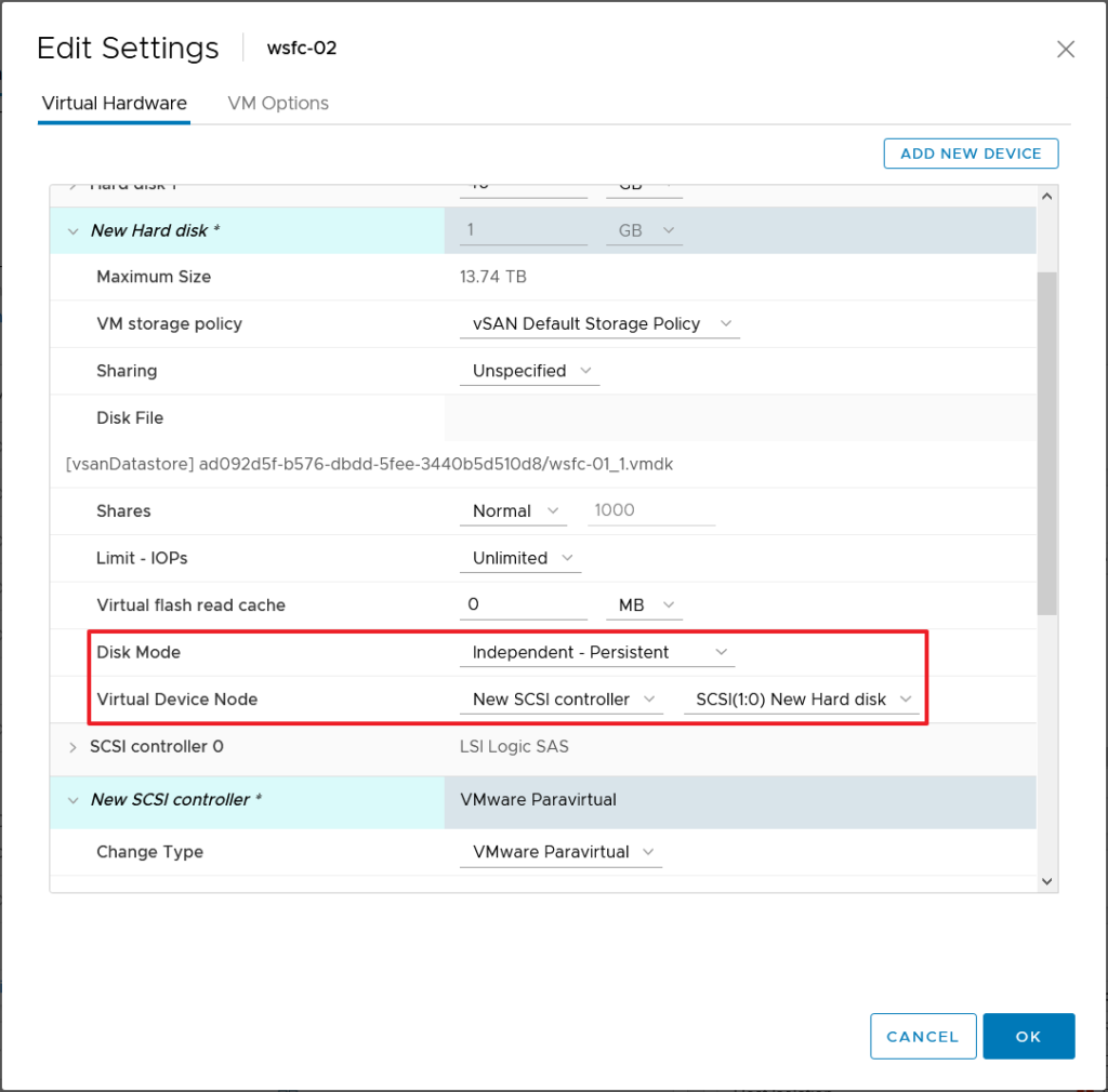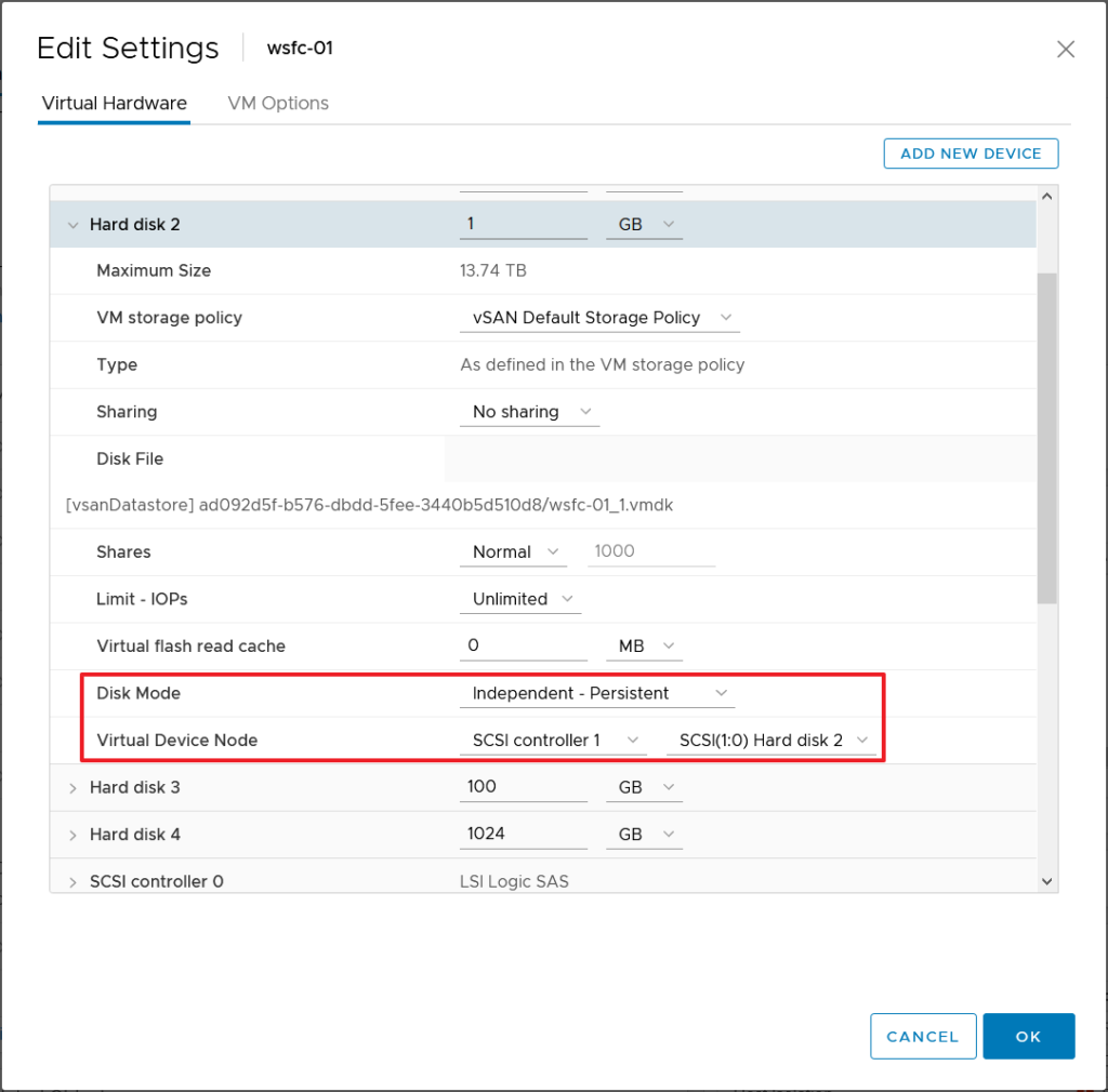 SCSI Controller를 추가한 다음, 공유해서 사용할 하드 디스크를 추가해준다. VM의 Edit Settings > ADD NEW DEVICE > Hard Disk 메뉴를 이용한다. 쿼럼 디스크 크기는 MS 문서에는 500MB 정도면 된다고 했으나, 여기서는 1GB로 설정했다. >를 눌러서 선택옵션을 표시되게 하고, 다음 항목들을 구성한다.