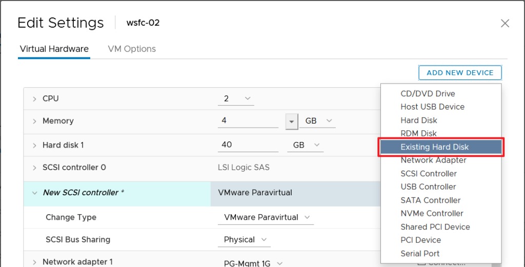 이제 공유해서 사용할 디스크는 다 생성되었다. WSFC 클러스터에 참여할 다른 VM들에 연결해주면 된다. 디스크 연결에 앞서서 VMware Paravirtual 유형의 SCSI 콘트롤러는 반드시 추가한 상태여야 한다.