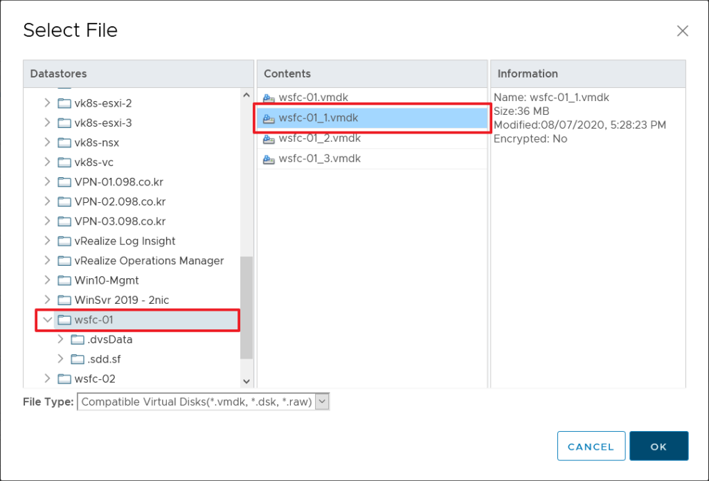 Existing Hard Disk 메뉴를 선택하면 그림과 같은 대화상자가 나와서 데이터스토어에서 VMDK 파일을 선택할 수 있다. VMDK 파일에 대한 구체적인 정보는 표시되지 않으니, 주의해서 선택하기 바란다.