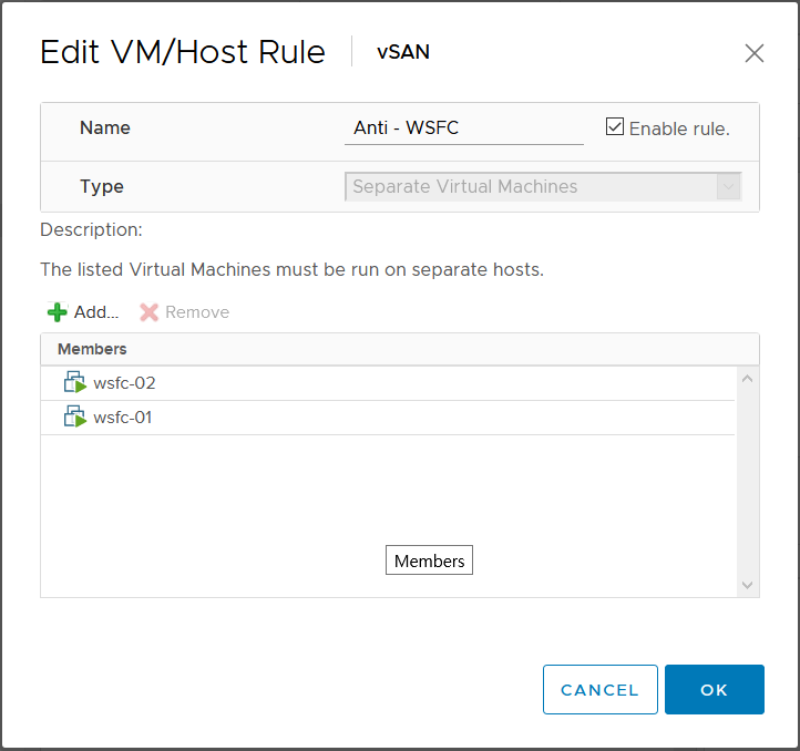 DRS를 사용하고 있는 환경이라면 Anti-Affinity 규칙을 설정해서 WSFC 노드들이 같은 호스트에 위치하지 않게하는 것이 권장사항이라고 한다.