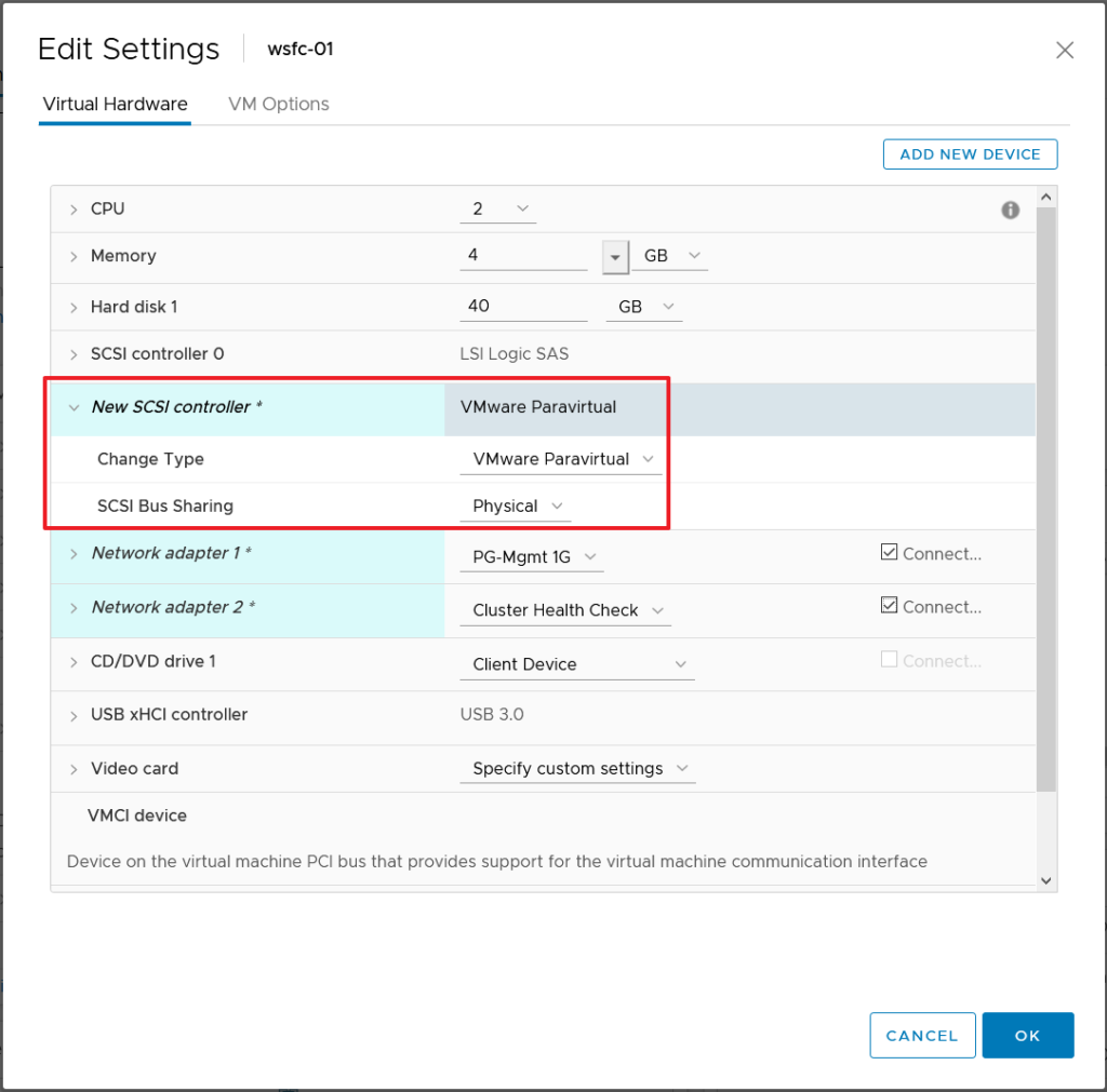 • SCSI Controller를 VMware Paravirtual 형식으로 추가 : 클러스터 VM에 모두 추가