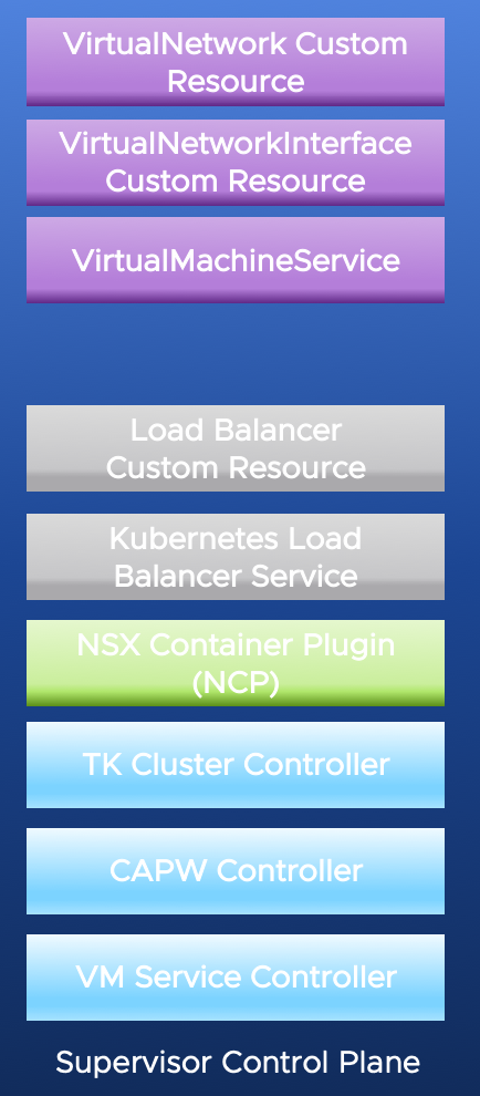 TK 클러스터는 클러스터 API를 구현하는 일련의 맞춤형 리소스에 의해 조정된다. Cluster API는 쿠버네티스 API를 이용해 쿠버네티스 클러스터의 라이프사이클을 관리하는 쿠베르네테스 라이프사이클 SIG의 오픈소스 프로젝트다. 이 API는 Cluster API 문서들이 관리 클러스터라고 부르는 것에서 실행되고 있다. 우리 환경의 관리 클러스터는 슈퍼바이저 클러스터다. Cluster API 구현에는 많은 맞춤형 리소스가 포함된다. 실제로 구현에 더 많은 기능이 포함되어 있는 경우, 아래의 3개의 컨트롤러와 NSX Container Plugin을 참조하여 기능을 요약하고 있다.