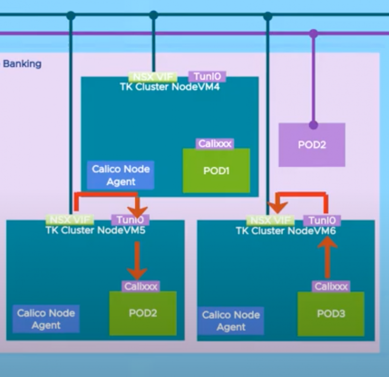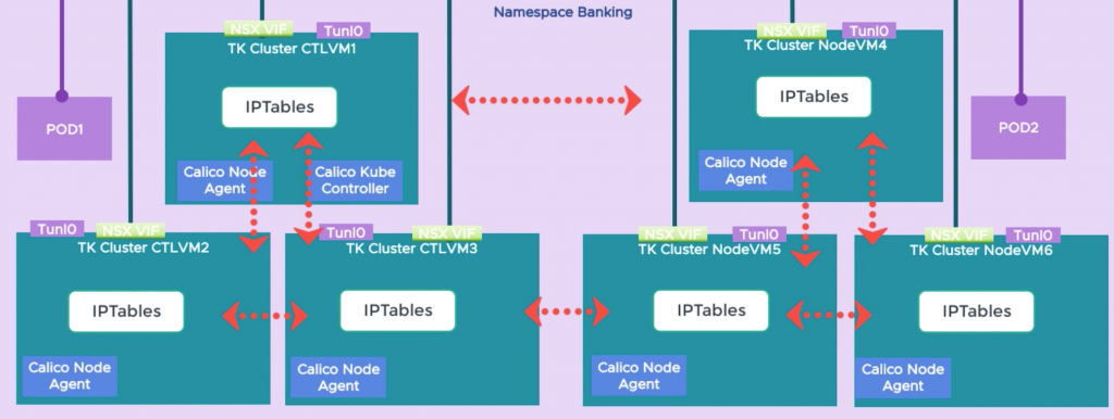 노드 간 포드 통신을 위해 트래픽은 Tunl0 인터페이스로 라우팅되고 대상 노드의 IP를 포함하는 새 헤더로 캡슐화된다. 노드는 또한 계층 3 게이트웨이로도 구성되고 Tunl0 트래픽은 NSX 가상 인터페이스를 벗어나 클러스터에 할당된 NSX 세그먼트를 통과하게 된다. 그런 다음 Tunl0에서 캡슐화되지 않은 적절한 노드로 라우팅되고 최종적으로 Calixxxxx veth 쌍을 통해 포드에 전달된다. NAT은 클러스터 외부 네트워크로 향하는 트래픽에만 발생한다.