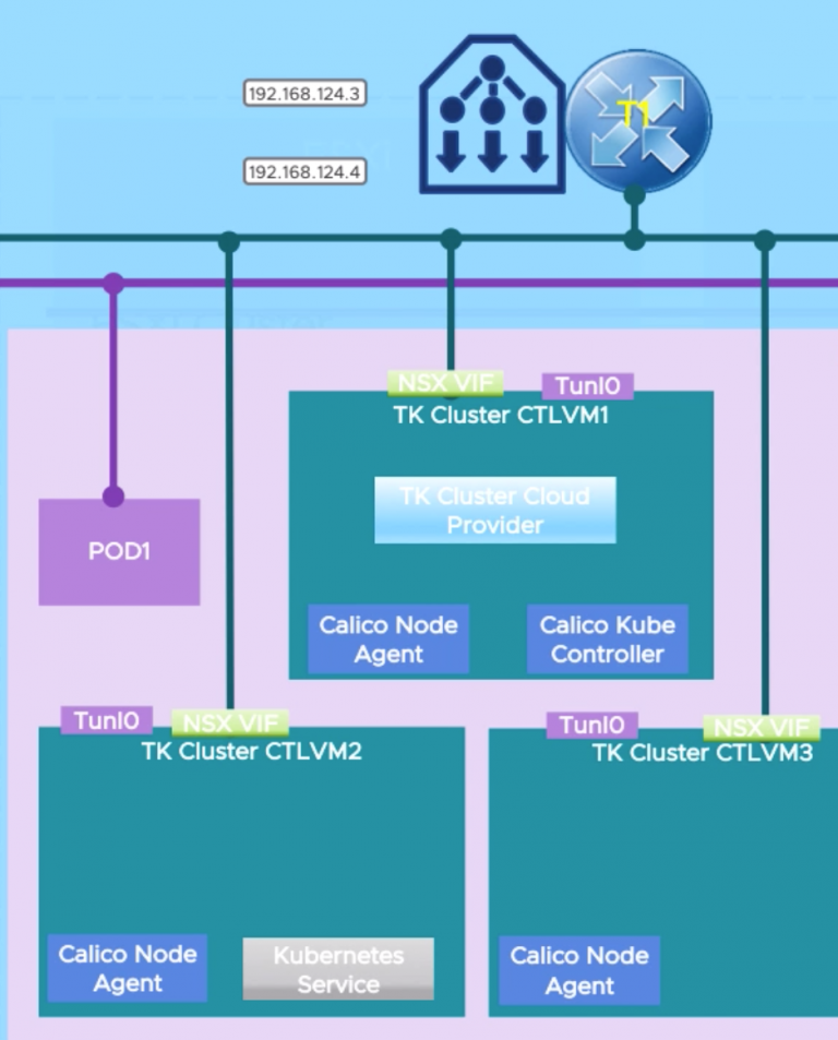 이것은 자원의 프록시를 위한 과정이다. TK 클러스터의 제어면에서 TK클러스터 클라우드 제공자가 가동되고 있다. TK 클러스터에 Kubernetes Load Balancer 서비스가 생성되면 클라우드 제공자가 슈퍼바이저 클러스터의 Kubernetes API에 전화를 걸어 VirtualMachineService 사용자 지정 리소스를 생성한다. 앞에서 설명한 대로 VirtualMachineService는 슈퍼바이저 클러스터에서 새로운 Kubernetes 로드 밸런서 서비스로 조정된다. 그런 다음 NCP는 해당 서비스를 NSX Virtual Server로 조정하고 서비스에 액세스하는 데 필요한 엔드포인트를 조정한다. 이로 인해 사용자는 원래 클러스터 로드 밸런싱 장치에서 새 IP를 통해 서비스에 액세스하게 된다.
